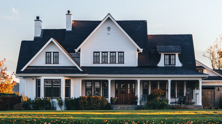 Elegant house with white siding and black roof against a clear sky