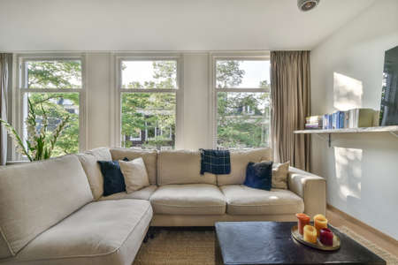 interior of modern living room with beige sofa and coffee table