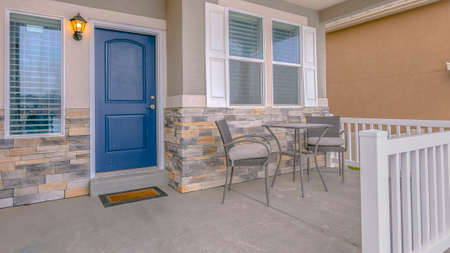 Panorama frame Front porch of traditional home and swinging chair. The front porch and door of a traditional home with a swinging chair.