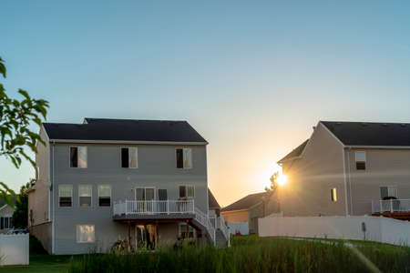 Home with balconies outdoor stairs and fence against sun and sky at sunset. Home exterior view with a vast grassy terrain in the foreground.