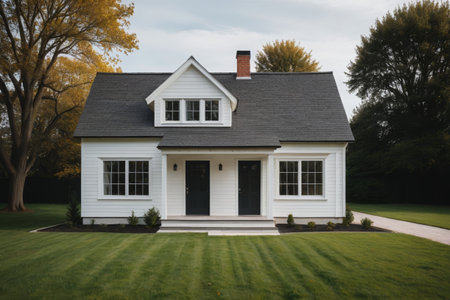 Single-family white cottage with front lawn