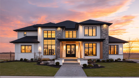 Modern house facade illuminated by a vibrant sunset, showing exterior design.