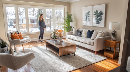 Bright and cozy living room with natural light, featuring modern decor and a woman enjoying a winter day indoors