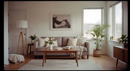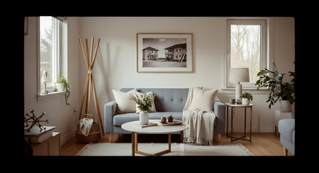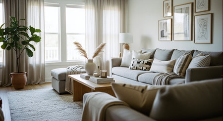 A well-lit living room features a white sofa with decorative pillows and a wooden coffee table. Neutral tones and natural light create a welcoming ambiance. Details include a vase with decorative flowers and framed artwork. This image is suitable for home decor and lifestyle concepts.