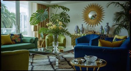 Luxury living room with blue sofa, coffee table and plant