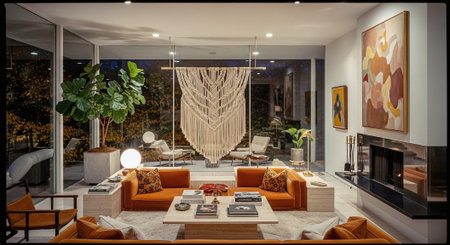 A stylish modern living room featuring orange sofas, a large macrame wall hanging, and floor-to-ceiling windows with a view of greenery outside