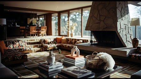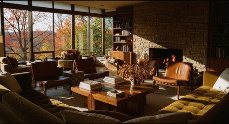 A cozy living room with large windows showcasing autumn foliage, featuring modern furniture, a stone fireplace, and warm lighting
