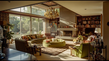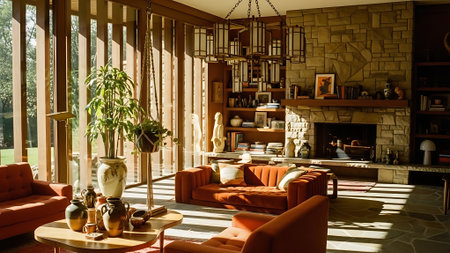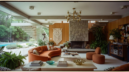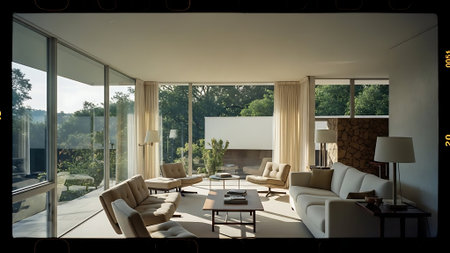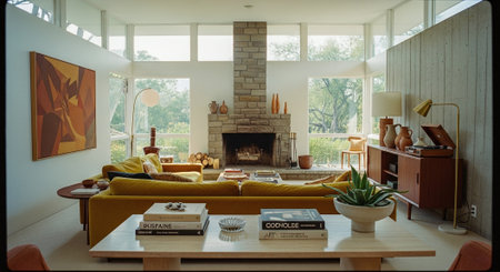 A cozy mid-century living room featuring ample natural light from large windows, elegant decor, and a welcoming garden view, perfect for relaxation and comfort.