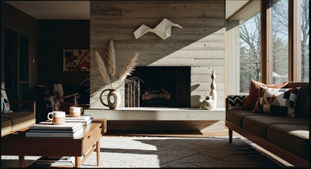 A modern living room featuring a concrete fireplace, stylish furniture, and decorative elements like vases and art pieces, with natural light streaming in