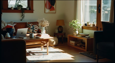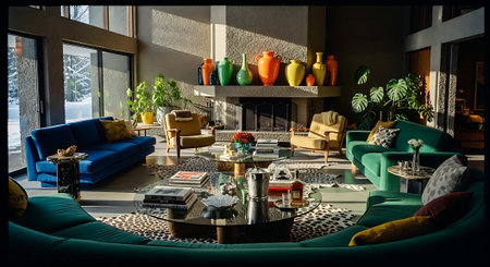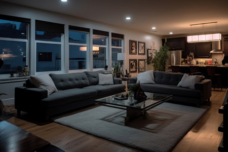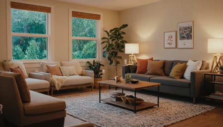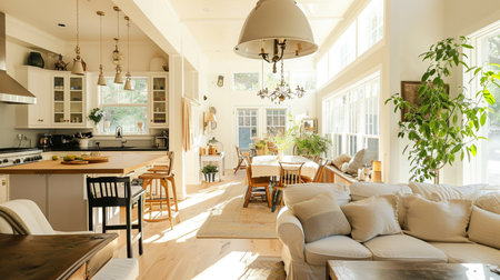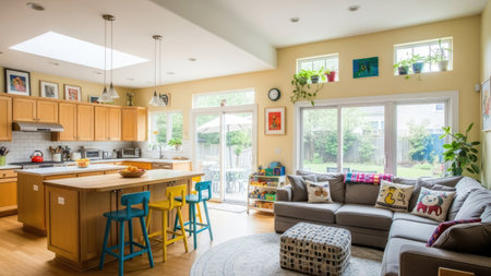 An inviting interior showcases a combined kitchen and living area featuring an open floor plan. The scene displays a mix of natural light and soft artificial illumination. The space incorporates wooden cabinetry, colorful seating, and various decorative elements. Suitable for illustrating home design, real estate, or lifestyle content.