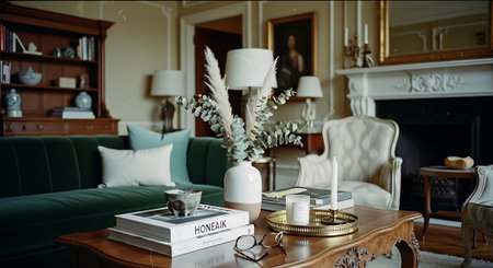 Luxury living room interior in classic style. Sofa, coffee table, books, candles and vase with flowers.