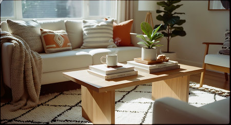 Bright living room featuring a white sofa, wooden coffee table, books, and potted plants. Decorated with patterned pillows and a textured rug.