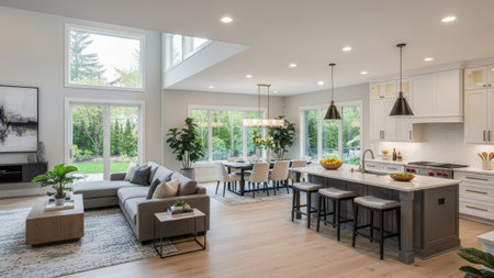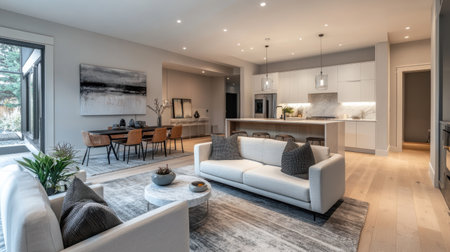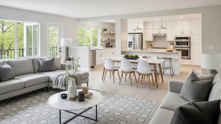 This interior showcases a contemporary living space with an open-concept design. Features include a modern kitchen, dining area, and living room. The scene is bathed in natural light from large windows, highlighting the minimalist decor. Suitable for architectural, real estate, and lifestyle content.