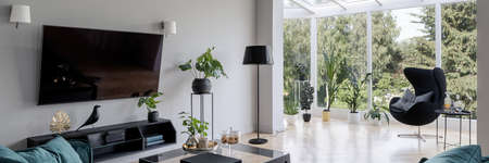 Panorama of stylish and elegant living room with big television screen and nice oriel window with forest view