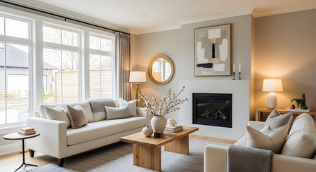 A beautifully staged modern living room with a bright and airy feel, decorated in neutral tones of white, beige, and grey. The room features two comfortable sofas, a wooden coffee table with a vase of blossoms, a sleek fireplace with abstract art, and large windows that let in ample natural light. This image represents contemporary home interior design and real estate.