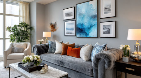 A beautifully designed living room featuring a stylish grey sofa adorned with colorful pillows, framed modern art, and cheerful indoor plants.