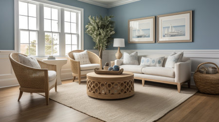 Living room decor, home interior design . Traditional Coastal style with Bay window decorated with Wood and Wicker material . Generative AI AIG26.