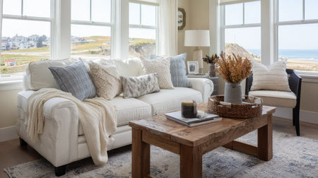 Living room decor, home interior design . Coastal Rustic style with Ocean View decorated with Wood and Linen material . Generative AI AIG26.