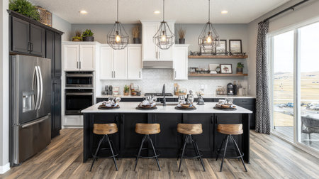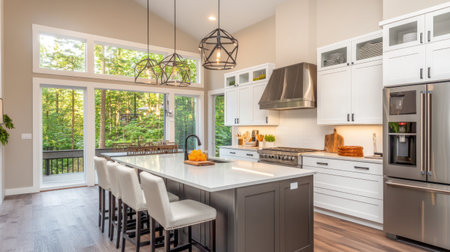 Discover a modern kitchen featuring sleek appliances and a spacious island, bathed in natural light from large windows. Perfect for elegant cooking and entertaining.