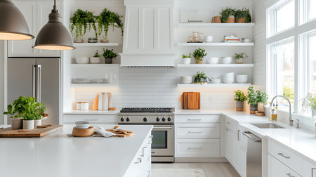 A bright and modern kitchen filled with fresh ingredients and herbs. This inviting space showcases natural light and greenery, perfect for culinary creative moments.
