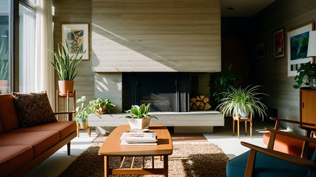 Living room decor, home interior design . Scandinavian Mid-century Modern style with Fireplace decorated with Wood and Leather material . Generative AI AIG26.