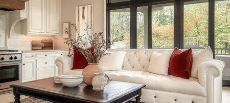 A cozy living room with modern decor, featuring large windows showcasing autumn foliage, stylish furniture, and decorative plants