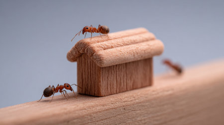 A captivating scene showcasing tiny ants exploring a beautifully crafted wooden house model. The soft background enhances the details and colors.