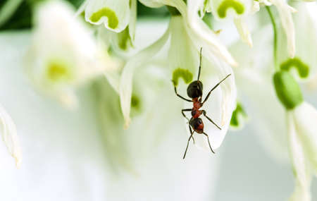 Macro shot of an ant exploring the stamen of a white lily in full bloom, with its details sharply focused