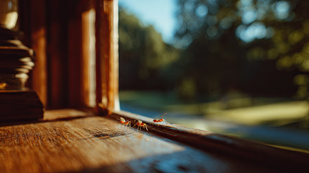 This captivating image captures ants exploring a wooden surface by a window, illuminated by warm sunlight, showcasing their intricate details and natural environment.