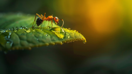A stunning macro shot of an ant perched on a leaf adorned with glistening dew drops, showcasing the intricate details and vibrant colors of this small creature in nature.