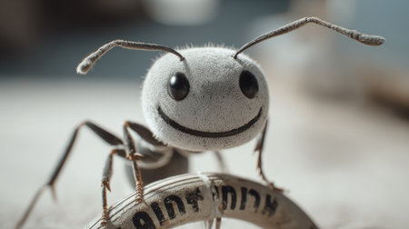A close-up illustration portrays a smiling ant character, showcasing intricate details. The creature, appearing friendly, is depicted with realistic textures and soft lighting. The image suggests a possible use for animation or advertising projects. The setting appears natural with subtle environmental elements.