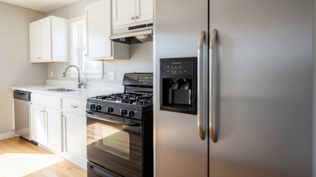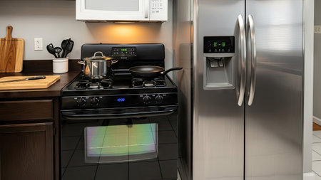Sleek kitchen appliances lined up in a contemporary setting, highlighting smart technology features for convenience.
