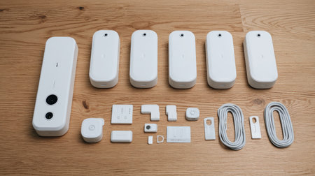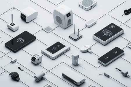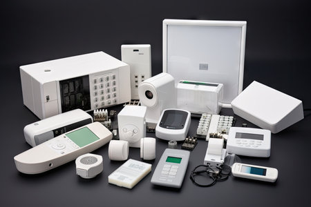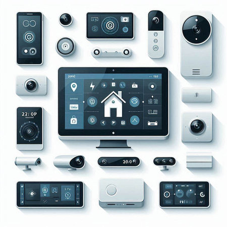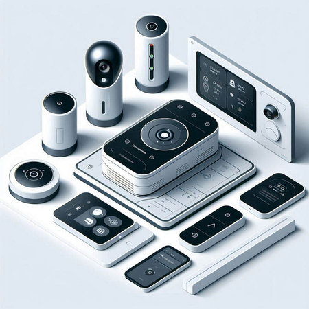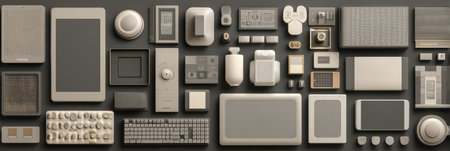 A visually striking arrangement of multiple electronic devices placed on a wall in an orderly manner, Monochromatic design of the Internet of Things (IoT) devices, AI Generated