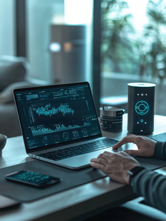 Professional Analyzing Financial Data and Charts on Laptop in Modern Workspace Business Analytics Data Visualization and Reporting in Technology Driven Office Environment