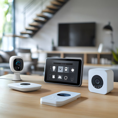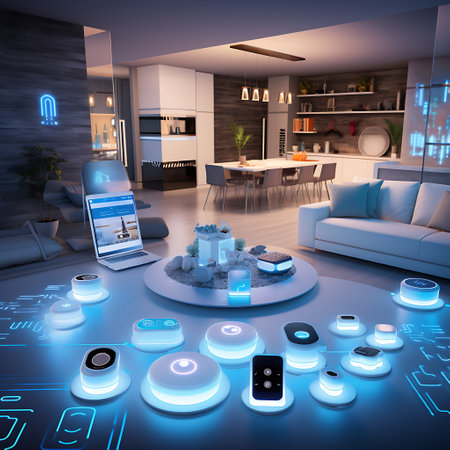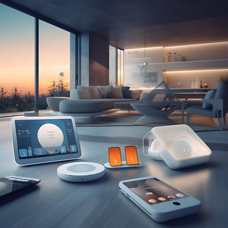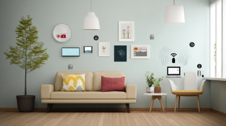 Smart home with interconnected devices showcasing advanced technology in a cozy, modern living space.