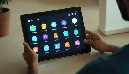 Hands hold a device with a smart home control interface, symbolizing the seamless connection between technology and home automation. AIG41