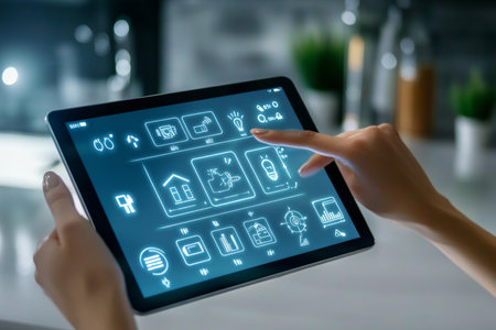 A person using a tablet to control smart home features in a modern kitchen. This image showcases technology integration in home design and convenience.