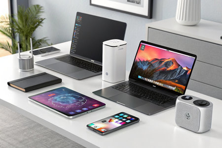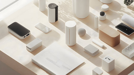 A modern arrangement of smart devices and accessories on a minimalist surface, exemplifying contemporary technology trends.