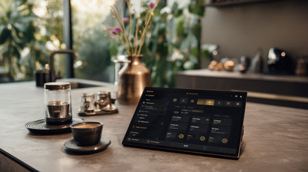 Modern interior featuring tablet displaying smart home control interface on wooden stand on marble table, enhancing convenience and connectivity in daily life
