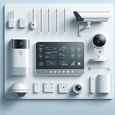 security system with array of motion and lighting sensors, cameras, and alarms, created with generative ai