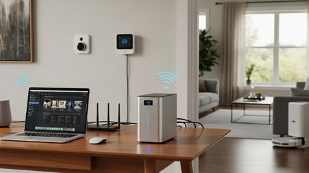 A contemporary home office setup featuring a laptop, smart speakers, a robot vacuum, and various tech gadgets connected wirelessly.