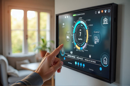 Sleek smart home control panel on living room wall displaying connected devices and climate settings