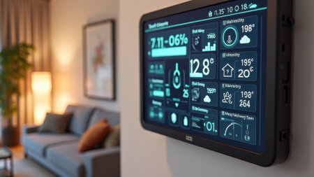 Smart home dashboard display with energy monitoring interface in modern living room. That the image is generated using AI.