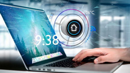 View of a Businessman holding a Button of a smart home automation app - 3d rendering