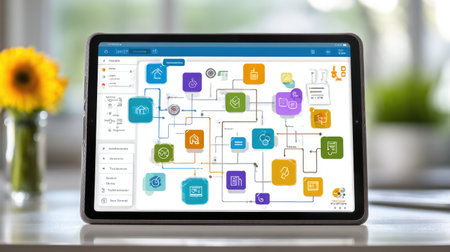 This image showcases a modern tablet displaying a vibrant digital interface, featuring various icons and flowchart patterns that represent different concepts and processes relevant to technology and business.