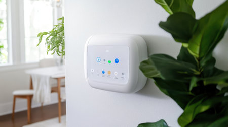 A sleek home automation panel is showcased on a smooth white wall, illuminated by natural light, complemented by vibrant foliage that enhances the room's appeal.