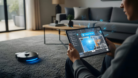 Person uses tablet to control robot vacuum cleaner with smart home app interface Clear details an...