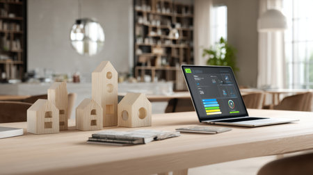 Explore a modern workspace featuring minimalist wooden house models and a laptop showcasing an analytics dashboard in a bright, stylish interior setting.