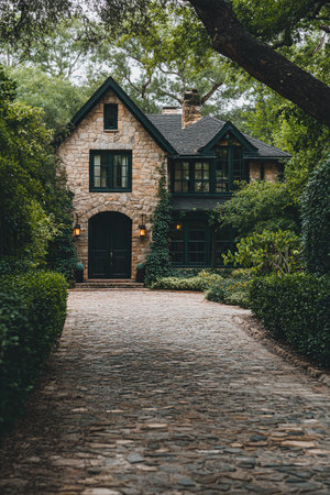 Home architecture design in Tudor Style with Half-timbered constructed by Brick and Timber material. Tudor Revival style. Generative AI AIG25 .