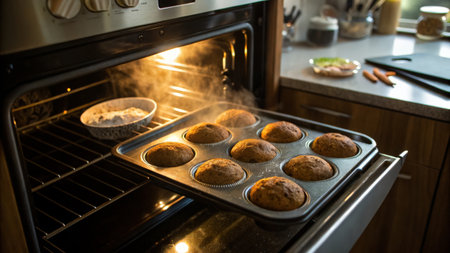 Freshly baked muffins create a cozy atmosphere with their golden crust and enticing aroma, making them an irresistible treat perfect for breakfast or snack time.
